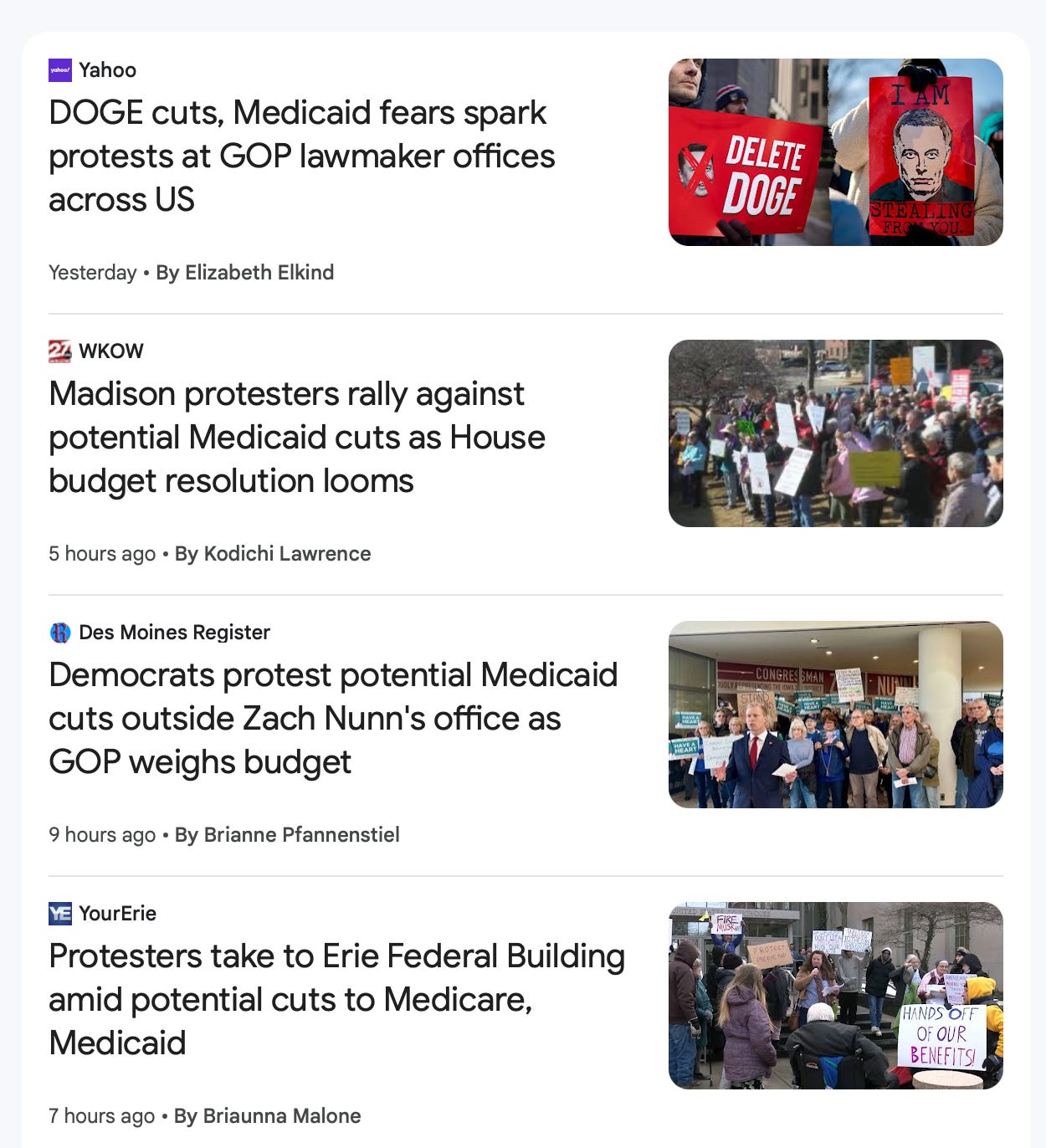 That’s essentially what progressives need to do right now. There is a groundswell of grassroots energy focused on protecting abortion access, trans kids, migrants, and other targeted communities. There is also rising action inside our side, with grassroots protests and flood of calls to Congress showing real energy. And while some Democrats in Congress are “pissed” about it, others are pushing for strategies to push back on federal contracts for SpaceX and Tesla. The emerging fight over Medicare cuts does provide a focal point with some real leverage on some swing GOP members. These are the kinds of focal points and targets that we need to find and aim at together.