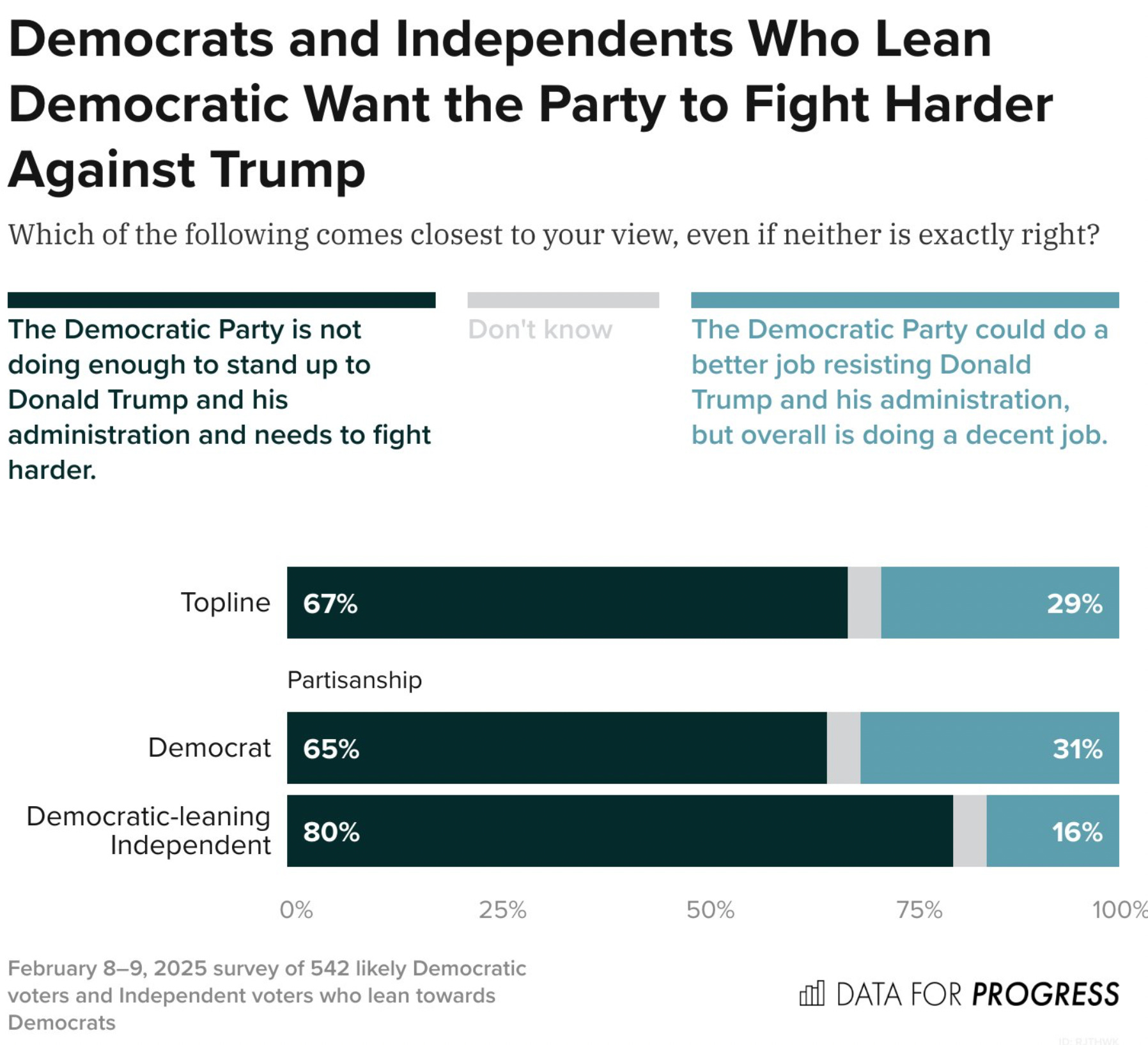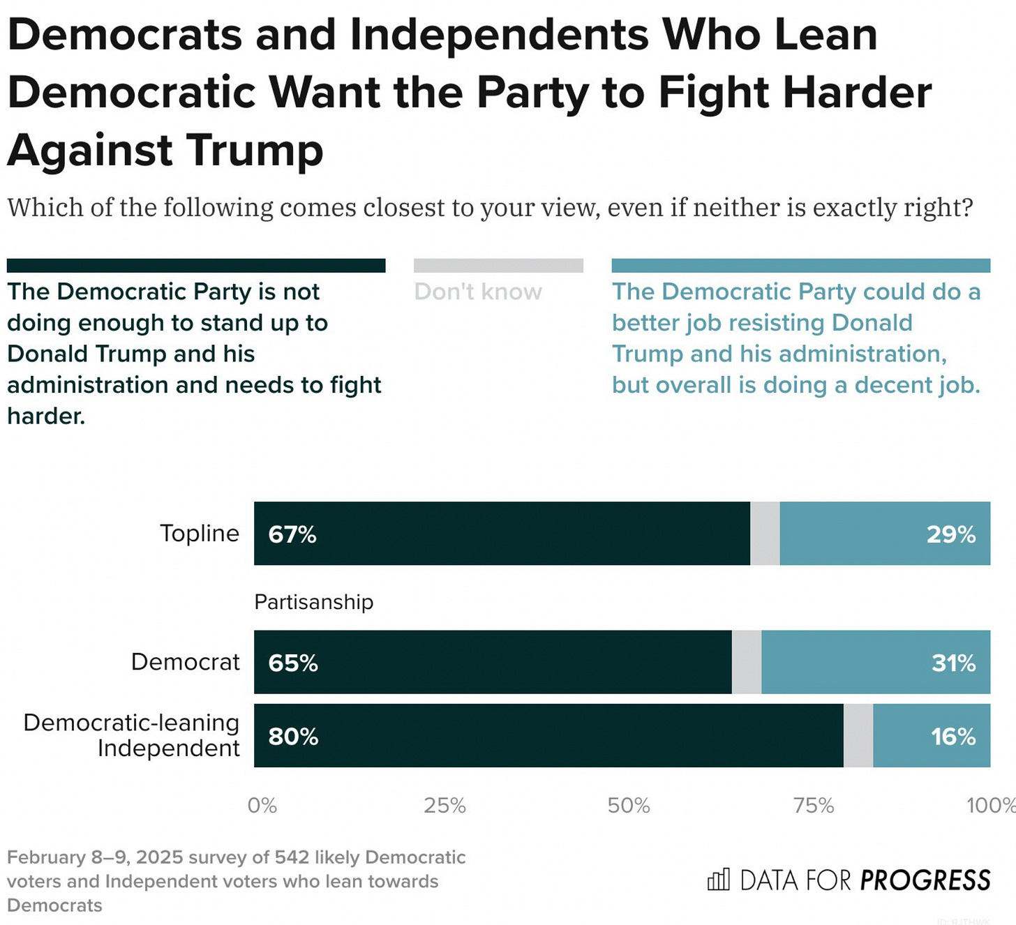 The notion of “Rolling Over and Playing Dead” is dangerous and stupid, especially at a moment when your own voters are turning on you for not doing anything, and your donors are not donating. We can’t act like we’re dead while our democracy actually dies. We need to fight back every step of the way, because we need momentum, moral clarity, and god damned energy. A Good Story needs rising action - and those on the sidelines need to see the ones in the ring actually throwing punches against the bad guys, and trying to knock them out. This poll from DFP reflects back the pent up energy we’re all feeling.