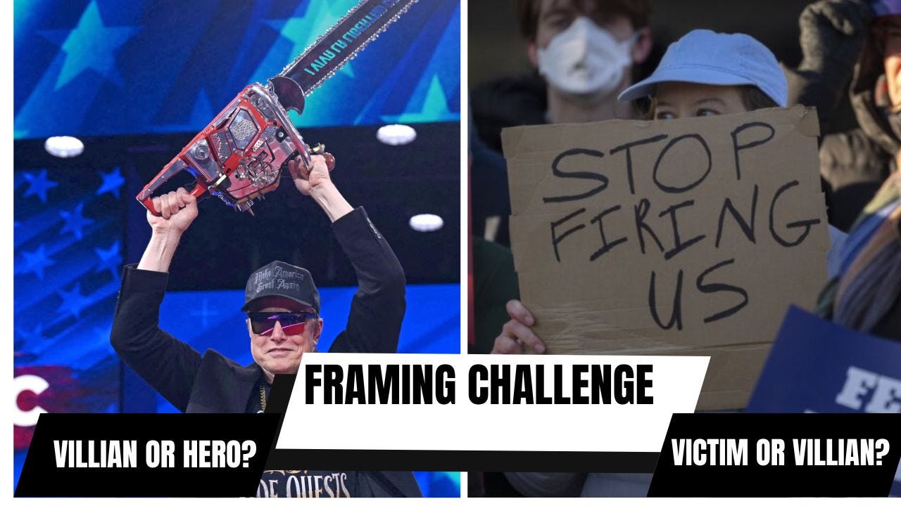 Elon’s drug-addled chainsaw massacre at CPAC (villian) is a stronger contrast against the stories of sympathetic victims of DOGE - like forest fire safety crews, and veteran suicide prevention counselors (victims). This contrast is helpful, and better than the working class guy on the ladder (hero) dismantling USAID vs. stammering explanations and high level arguments about Article II. But some progressives went so far as to declare that the “Coup has failed,” citing polling showing Trump and Elon with low favorability.